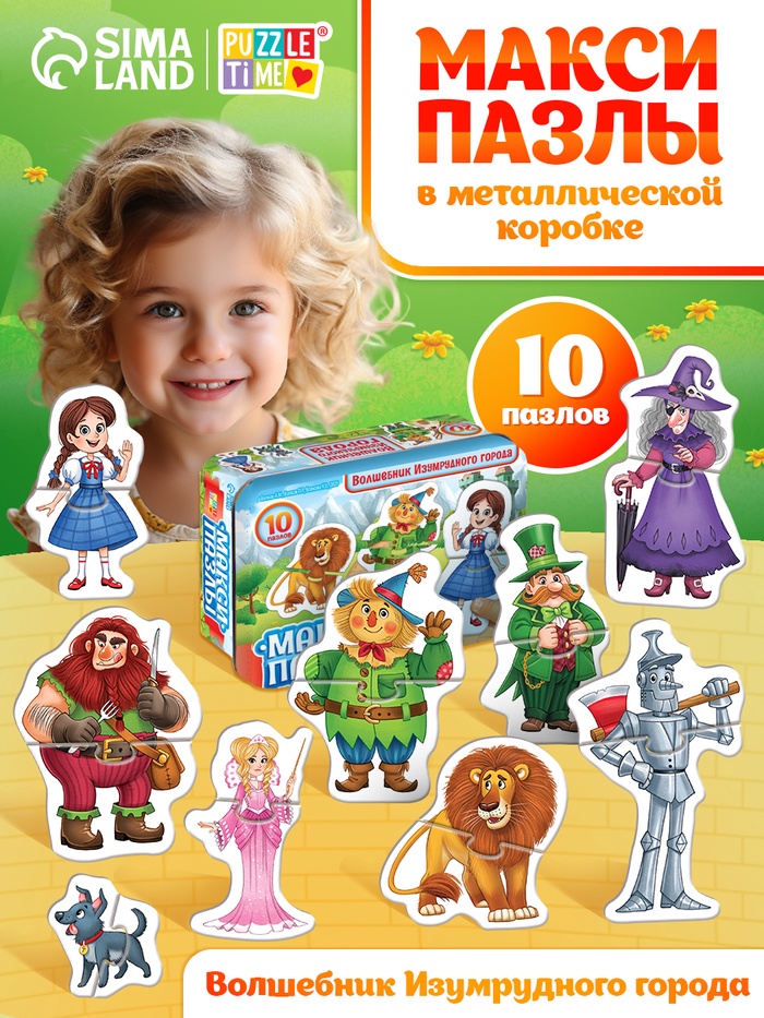 Макси-пазлы в металлической коробке "Волшебник изумрудного города" 10 пазлов, 20 деталей