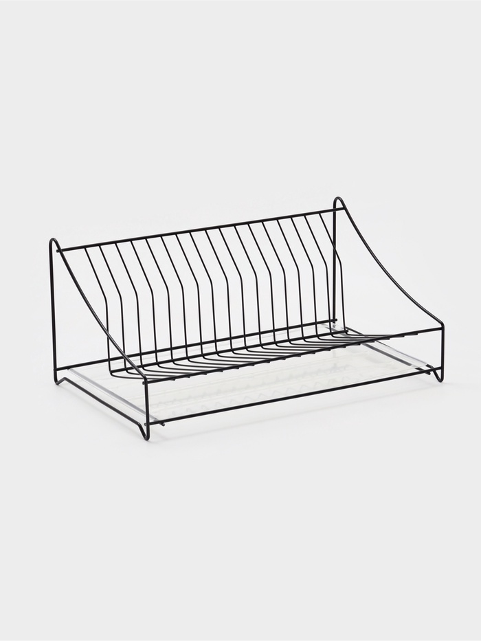 Чёрная сушилка для тарелок — узкая настольная подставка с поддоном, созданная для кухонь с ограниченным пространством. Размеры 38×17,5×23,5 см позволяют разместить всю основную посуду — от плоских тарелок до глубоких мисок — без загромождения столешницы. Металлическая конструкция в матовом чёрном исполнении устойчива к влаге, не ржавеет и визуально сливается с современной кухонной техникой.