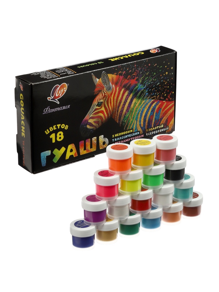 Гуашь 18 цветов × 15 мл, «Луч: Фантазия», (классические + неоновые + перламутровые + золотой + серебряный)